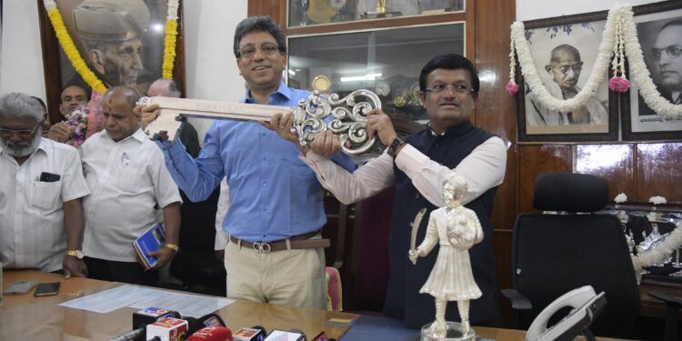 ಬೆಂಗಳೂರು, ಏ.30 www.bengaluruwire.com : ಬೃಹತ್ ಬೆಂಗಳೂರು ಮಹಾನಗರ ಪಾಲಿಕೆಯ ನಿರ್ಗಮಿತ ಆಡಳಿತಗಾರರಾದ ಉಮಾಶಂಕರ್ ನೂತನ ಆಡಳಿತಗಾರರಿಗೆ ತುಷಾರ್ ಗಿರಿನಾಥ್ ಅವರಿಗೆ ಬೆಳ್ಳಿಯ ನಾಡಪ್ರಭು ಕೆಂಪೇಗೌಡ ಪ್ರತಿಮೆ ಹಾಗೂ ಕೀಲಿ ಕೈಯನ್ನು ಸಾಂಕೇತಿಕವಾಗಿ ನೀಡುವ ಮೂಲಕ ಅಧಿಕಾರ ಹಸ್ತಾಂತರಿಸಿದರು.