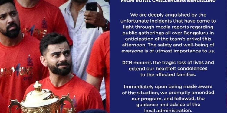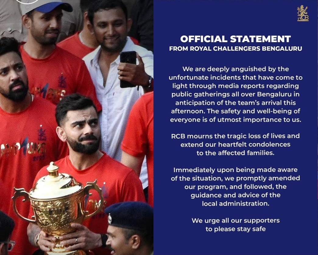 ಈ ಕುರಿತು ಆರ್ಸಿಬಿಯ ಅಧಿಕೃತ ಹೇಳಿಕೆಯನ್ನು ಪೋಸ್ಟ್ ಮಾಡಿರುವ ಅವರು, “ಇಂದು ಮಧ್ಯಾಹ್ನ ತಂಡದ ಆಗಮನದ ನಿರೀಕ್ಷೆಯಲ್ಲಿ ಬೆಂಗಳೂರಿನಾದ್ಯಂತ ಸಾರ್ವಜನಿಕ ಸಭೆಗಳ ಕುರಿತು ಮಾಧ್ಯಮ ವರದಿಗಳ ಮೂಲಕ ಬೆಳಕಿಗೆ ಬಂದಿರುವ ದುರದೃಷ್ಟಕರ ಘಟನೆಗಳಿಂದ ನಾವು ತೀವ್ರ ದುಃಖಿತರಾಗಿದ್ದೇವೆ. ಪ್ರತಿಯೊಬ್ಬರ ಸುರಕ್ಷತೆ ಮತ್ತು ಯೋಗಕ್ಷೇಮ ನಮಗೆ ಅತ್ಯಂತ ಮುಖ್ಯವಾಗಿದೆ”.
