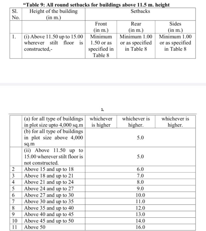 11.5 ಮೀಟರ್ಗಿಂತ ಹೆಚ್ಚಿನ ಎತ್ತರದ ಕಟ್ಟಡಗಳಿಗೆ ಸುತ್ತಲೂ ಬಿಡಬೇಕಾದ ಸೆಟ್ ಬ್ಯಾಕ್ಗಳ ವಿವರಗಳನ್ನು ಕೆಳಗಿನ ಕೋಷ್ಟಕದಲ್ಲಿ ನೀಡಲಾಗಿದೆ: