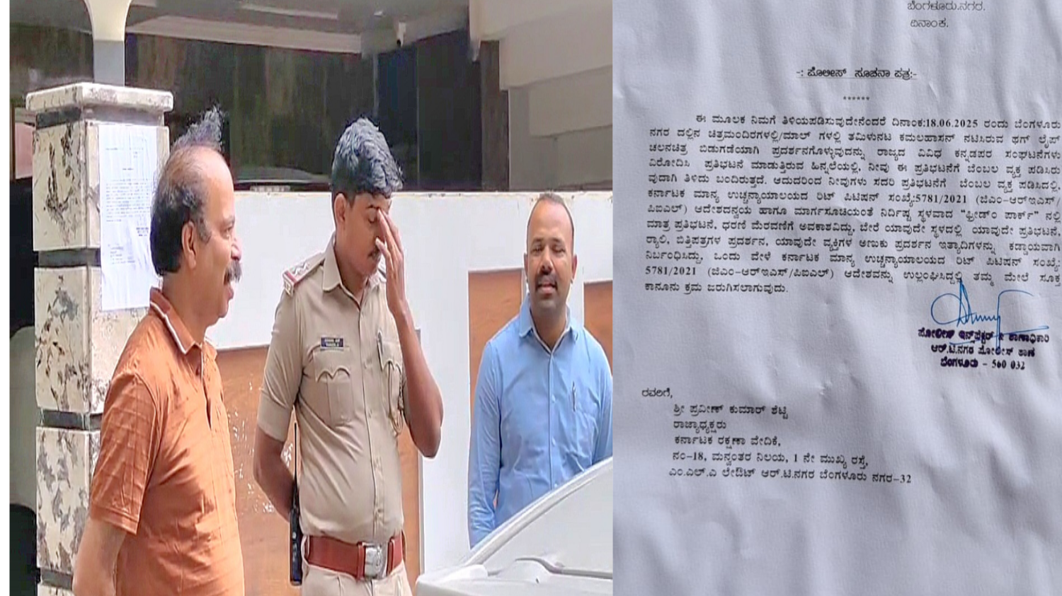 ಇಂದು (ಜೂನ್ 18) ಬೆಂಗಳೂರಿನ ಚಿತ್ರಮಂದಿರಗಳು ಮತ್ತು ಮಾಲ್‌ಗಳಲ್ಲಿ ‘ಥಗ್ ಲೈಫ್’ ಸಿನಿಮಾ ಪ್ರದರ್ಶನಗೊಳ್ಳುತ್ತಿದ್ದು, ಇದನ್ನು ಕನ್ನಡಪರ ಸಂಘಟನೆಗಳು ತೀವ್ರವಾಗಿ ವಿರೋಧಿಸುತ್ತಿವೆ. ಈ ಪ್ರತಿಭಟನೆಗೆ ಪ್ರವೀಣ್ ಶೆಟ್ಟಿ ನೇತೃತ್ವದ ಕರವೇ ಬೆಂಬಲ ನೀಡಿರುವುದಾಗಿ ತಿಳಿದುಬಂದಿದೆ. ಇದರ ಬೆನ್ನಲ್ಲೇ, ಆರ್. ಟಿ. ನಗರ ಪೊಲೀಸರು ಮುನ್ನೆಚ್ಚರಿಕಾ ಕ್ರಮವಾಗಿ ಪ್ರವೀಣ್ ಶೆಟ್ಟಿ ಅವರ ಮನೆಗೆ ನೋಟಿಸ್ ಅಂಟಿಸಿದ್ದಾರೆ.