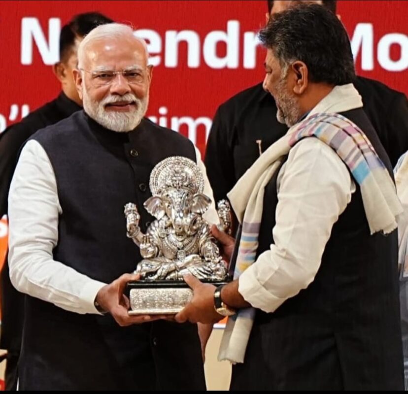 ನಮ್ಮ ಮೆಟ್ರೋ ಹಳದಿ ಮಾರ್ಗ ಲೋಕಾರ್ಪಣೆ ಸಂದರ್ಭದಲ್ಲಿ ಪ್ರಧಾನಿ ಮೋದಿಗೆ ಬೆಳ್ಳಿ ವಿಗ್ರಹ ವಿತರಿಸಿದ ಡಿಸಿಎಂ ಡಿ.ಕೆ.ಶಿವಕುಮಾರ್.