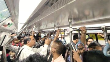 ಹಳದಿ ಮಾರ್ಗದ ಮೆಟ್ರೋ ರೈಲಿನಲ್ಲಿ ಕಿಕ್ಕಿರಿದು ತುಂಬಿರುವ ಪ್ರಯಾಣಿಕರು.