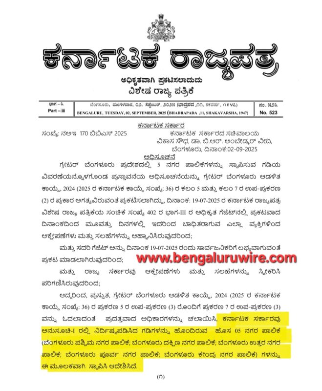 ಬೆಂಗಳೂರು, ಸೆ.02 www.bengaluruwire.com : ರಾಜ್ಯ ಸರ್ಕಾರವು ಅಂತು ಇಂತೂ ಅಂತಿಮವಾಗಿ ಗ್ರೇಟರ್ ಬೆಂಗಳೂರು ಪ್ರಾಧಿಕಾರ (GBA)ದ ಅಡಿಯಲ್ಲಿ ಇಂದು (ಸೆಪ್ಟೆಂಬರ್ 2) ಅಧಿಕೃತವಾಗಿ ಜಿಬಿಎ ವ್ಯಾಪ್ತಿಯಲ್ಲಿ ಐದು ನಗರ ಪಾಲಿಕೆಗಳನ್ನು ಅಧಿಕೃತವಾಗಿ ರಚಿಸಿ ಅಂತಿಮ ಆದೇಶ ಹೊರಡಿಸಿದೆ.