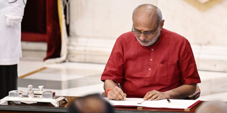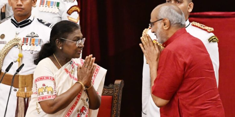 ರಾಷ್ಟ್ರಪತಿ ದ್ರೌಪದಿ ಮುರ್ಮು ಅವರು ಸಿ.ಪಿ. ರಾಧಾಕೃಷ್ಣನ್ ಅವರಿಗೆ ಅಧಿಕಾರ ಮತ್ತು ಗೌಪ್ಯತೆಯ ಪ್ರಮಾಣವಚನ ಬೋಧಿಸಿದರು.