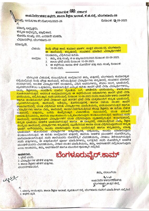 ಈ ಕುರಿತು ಶಾಲಾ ಶಿಕ್ಷಣ ಮತ್ತು ಸಾಕ್ಷರತೆ ಇಲಾಖೆ ಸಚಿವ ಮಧು ಬಂಗಾರಪ್ಪ ಹಾಗೂ ಸರ್ಕಾರದ ಮುಖ್ಯ ಕಾರ್ಯದರ್ಶಿ ಶಾಲಿನಿ ರಜನೀಶ್ ಅವರಿಗೆ ಪತ್ರ ಬರೆದಿರುವ ಡಾ.ಬಿಳಿಮಲೆ, ಈ ವಿಷಯದ ಕುರಿತು ವರದಿ ಸಲ್ಲಿಸಿರುವ ಬೆಂಗಳೂರು ಉತ್ತರ ಜಿಲ್ಲೆಯ ಶಾಲಾ ಶಿಕ್ಷಣ ಇಲಾಖೆಯ ಉಪ ನಿರ್ದೇಶಕರು ನೀಡಿರುವ ದಾಖಲೆಗಳ ಪ್ರಕಾರ, ಸಿಂಧಿ ಪ್ರೌಢಶಾಲೆಯ ಪ್ರಾಂಶುಪಾಲರೇ ಕನ್ನಡದಲ್ಲಿ ಮಾತನಾಡಿದ ವಿದ್ಯಾರ್ಥಿಗಳಿಗೆ ದಂಡ ವಿಧಿಸಿರುವುದನ್ನು ಒಪ್ಪಿಕೊಂಡಿದ್ದಾರೆ ಎಂದು ತಿಳಿಸಿದ್ದಾರೆ.
