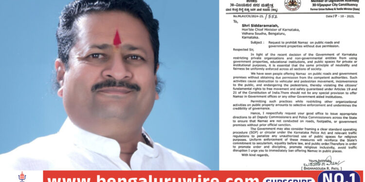 ಈ ನಿರ್ಧಾರದ ಬೆನ್ನಲ್ಲೇ, ವಿಜಯಪುರ ಶಾಸಕ ಹಾಗೂ ಮಾಜಿ ಸಚಿವರಾದ ಬಸನಗೌಡ ಪಾಟೀಲ್ ಯತ್ನಾಳ್ ಕಾಂಗ್ರೆಸ್ ಸರ್ಕಾರಕ್ಕೆ ಠಕ್ಕರ್ ನೀಡಿದ್ದು, ಮುಖ್ಯಮಂತ್ರಿ ಸಿದ್ದರಾಮಯ್ಯ ಅವರಿಗೆ ಅ.17ರಂದು ಪತ್ರ ಬರೆದಿದ್ದಾರೆ. ಸರ್ಕಾರದ ಅನುಮತಿಯಿಲ್ಲದೆ ಸಾರ್ವಜನಿಕ ರಸ್ತೆ ಮತ್ತು ಸರ್ಕಾರಿ ಆವರಣಗಳಲ್ಲಿ ನಮಾಜ್ ಮಾಡುವುದನ್ನು ನಿಷೇಧಿಸಬೇಕು ಎಂದು ಆಗ್ರಹಿಸಿದ್ದಾರೆ. ಇದನ್ನು ಅವರು ತಮ್ಮ ಅಧಿಕೃತ ಎಕ್ಸ್ ಜಾಲತಾಣದಲ್ಲಿ ಬಹಿರಂಗವಾಗಿ ಪ್ರಕಟಿಸಿದ್ದಾರೆ.