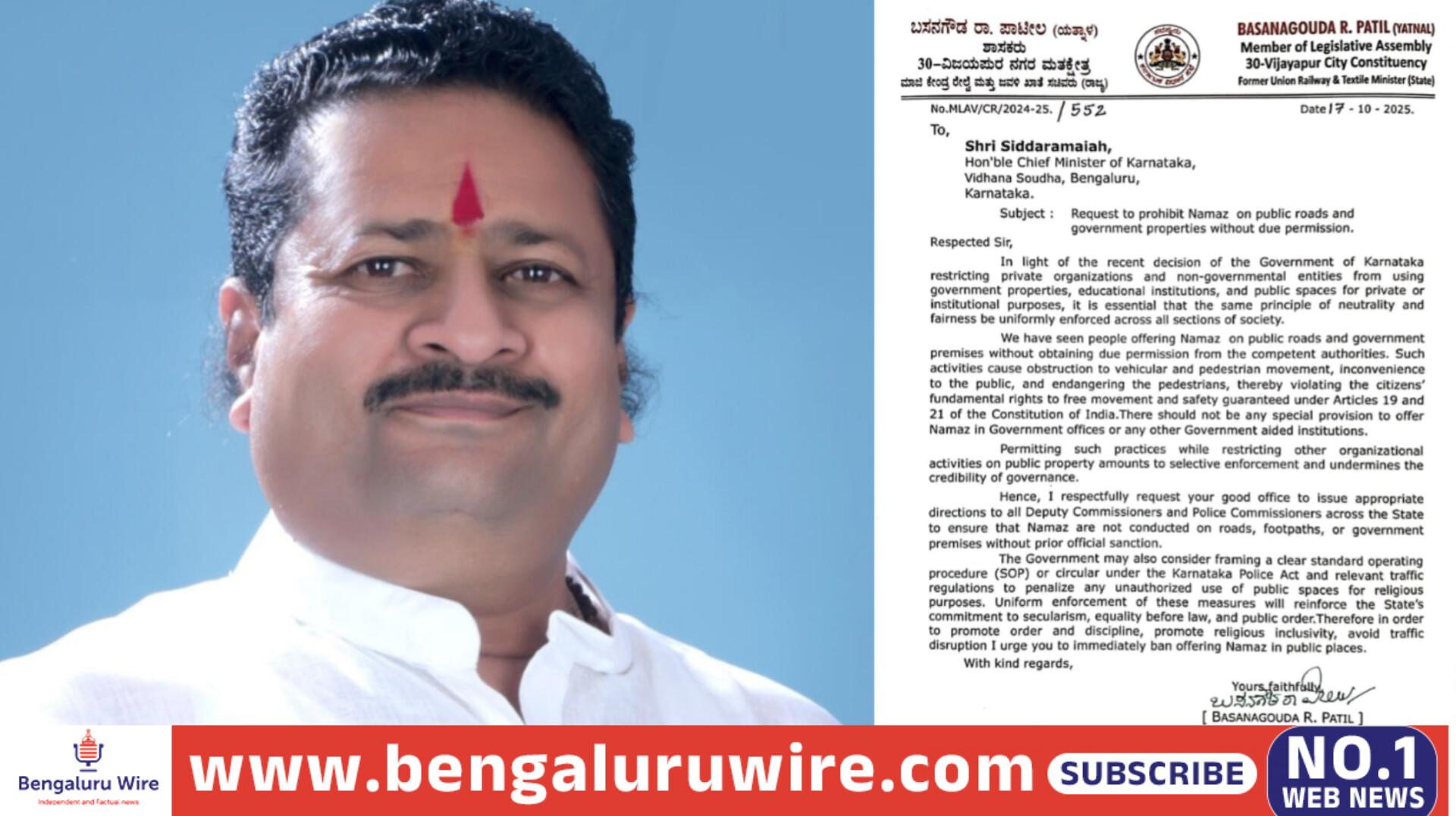 ಯತ್ನಾಳ್ ಅವರು ಮುಖ್ಯಮಂತ್ರಿಗಳಿಗೆ ಬರೆದ ಪತ್ರದಲ್ಲಿ, “ಪೂರ್ವಾನುಮತಿಯಿಲ್ಲದೆ ಸಾರ್ವಜನಿಕ ರಸ್ತೆಗಳು ಮತ್ತು ಸರ್ಕಾರಿ ಆಸ್ತಿಗಳ ಮೇಲೆ ಜನರು ನಮಾಜ್ ಸಲ್ಲಿಸುತ್ತಿರುವುದನ್ನು ನಾವು ನೋಡಿದ್ದೇವೆ. ಇಂತಹ ಚಟುವಟಿಕೆಗಳು ಸಾರ್ವಜನಿಕರಿಗೆ ತೊಂದರೆ, ಪಾದಚಾರಿ ಮತ್ತು ವಾಹನ ಸಂಚಾರಕ್ಕೆ ಅಡಚಣೆಯನ್ನುಂಟುಮಾಡುತ್ತವೆ ಮತ್ತು ನಾಗರಿಕರ ಮೂಲಭೂತ ಹಕ್ಕುಗಳಾದ ಸಂವಿಧಾನದ ಕಲಂ 19 ಮತ್ತು 21 ರ ಅಡಿಯಲ್ಲಿ ಖಾತರಿಪಡಿಸಿದ ಮುಕ್ತ ಸಂಚಾರ ಮತ್ತು ಭದ್ರತೆಗೆ ಧಕ್ಕೆ ತರುತ್ತವೆ,” ಎಂದು ಸ್ಪಷ್ಟವಾಗಿ ಹೇಳಿದ್ದಾರೆ.