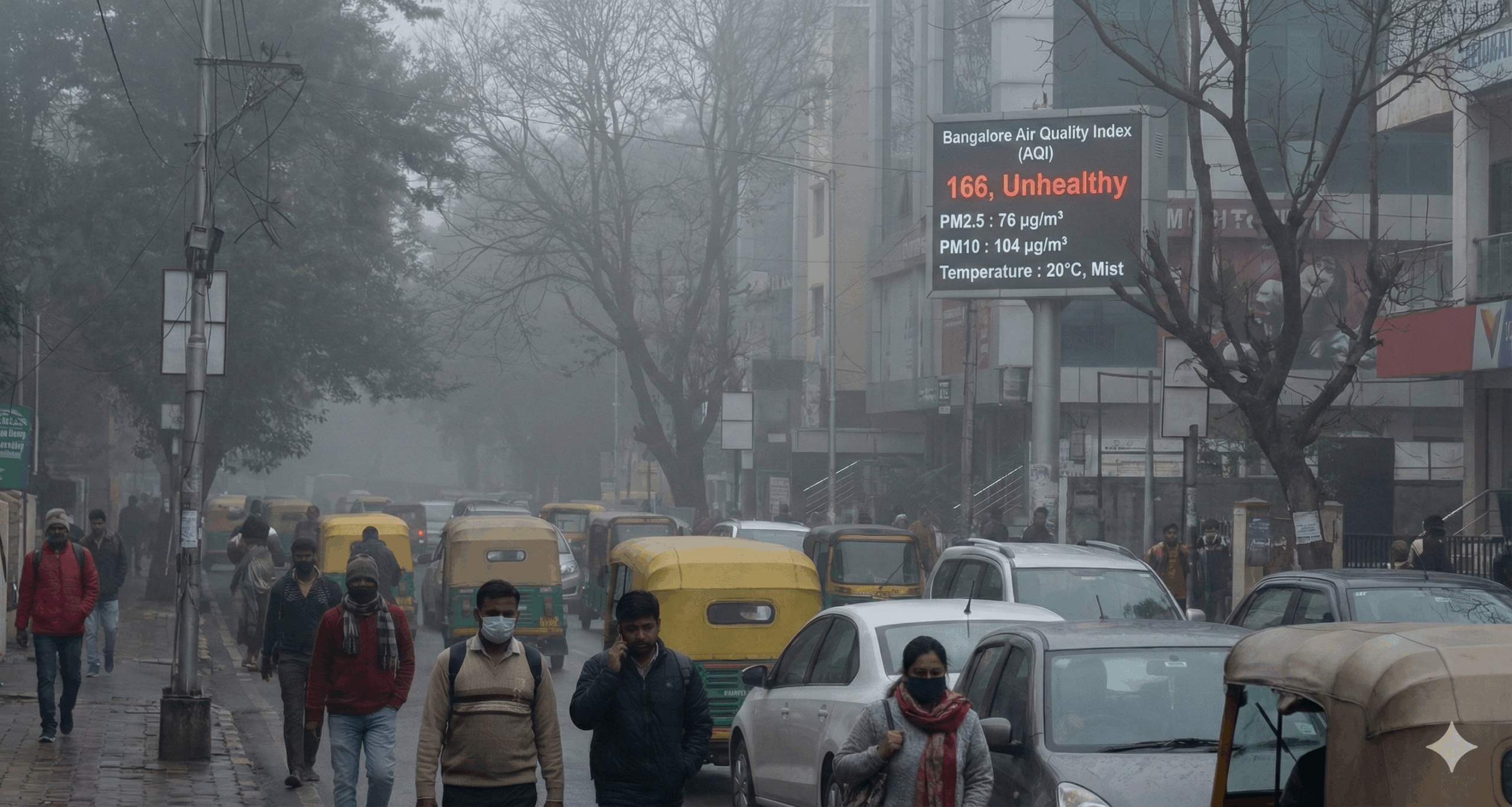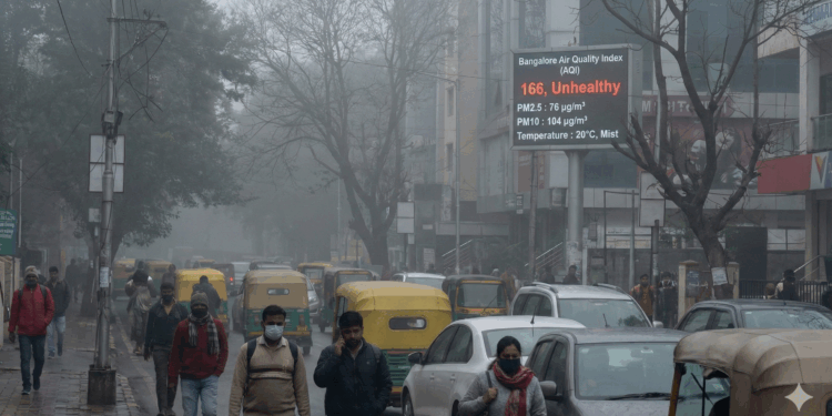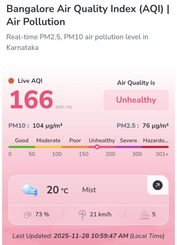 ಕೇವಲ ಚಳಿ ಮಾತ್ರವಲ್ಲದೆ, ನಗರದ ವಾಯು ಗುಣಮಟ್ಟದ ಬಗ್ಗೆಯೂ ಹವಾಮಾನ ಕುರಿತು ಮಾಹಿತಿ ನೀಡುವ ಎಕ್ಯುಐ ಹಾಗೂ ಕರ್ನಾಟಕ ರಾಜ್ಯ ಮಾಲಿನ್ಯ ನಿಯಂತ್ರಣ ಮಂಡಳಿ (KSPCB) ಮಾಹಿತಿಯು ಕಳವಳ ವ್ಯಕ್ತಪಡಿಸಿದೆ. ನವೆಂಬರ್ 28ರ ದತ್ತಾಂಶಗಳ ಪ್ರಕಾರ, ನಗರದ ಹಲವು ಭಾಗಗಳಲ್ಲಿ ವಾಯು ಗುಣಮಟ್ಟ ಸೂಚ್ಯಂಕ (AQI) 150 ರಿಂದ 200ರ ಗಡಿ ದಾಟಿದ್ದು, ‘ಅನಾರೋಗ್ಯಕರ’ (Moderate to Poor) ಶ್ರೇಣಿಯಲ್ಲಿದೆ. ತಾಪಮಾನ ಇಳಿಕೆಯಾದಾಗ ಗಾಳಿಯಲ್ಲಿನ ಧೂಳಿನ ಕಣಗಳು (Particulate Matter) ಕೆಳಮಟ್ಟದಲ್ಲೇ ತೇಲಾಡುವುದರಿಂದ ಮಾಲಿನ್ಯದ ಪ್ರಮಾಣ ಹೆಚ್ಚಾಗಿ ಕಾಣುತ್ತಿದೆ.