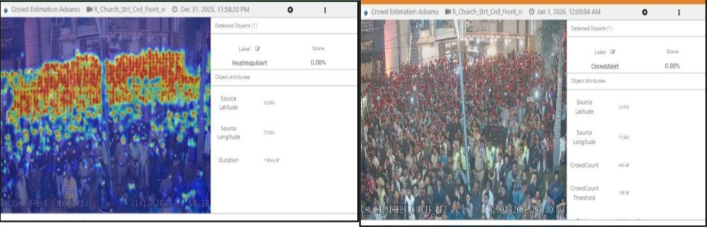 ನಗರದ ಪ್ರಮುಖ ಪ್ರದೇಶಗಳಾದ ಎಂ.ಜಿ. ರಸ್ತೆ, ಬ್ರಿಗೇಡ್ ರಸ್ತೆ, ಚರ್ಚ್ ಸ್ಟ್ರೀಟ್, ಇಂದಿರಾನಗರ ಮತ್ತು ಕೋರಮಂಗಲದಲ್ಲಿ ಹೊಸ ವರ್ಷದ ಸಂಭ್ರಮಕ್ಕಾಗಿ ಜನಸಾಗರವೇ ಹರಿದುಬಂದಿತ್ತು. ಈ ಜನಸಂದಣಿಯನ್ನು ನಿಯಂತ್ರಿಸಲು ಮತ್ತು ಸಾರ್ವಜನಿಕರ ಸುರಕ್ಷತೆಗಾಗಿ ಹನೀವೆಲ್ (Honeywell) ಮತ್ತು ಎವಿರೋಸ್ (Awiros) ಎಐ ಪ್ಲಾಟ್ಫಾರ್ಮ್ ಆಧಾರಿತ ಅತ್ಯಾಧುನಿಕ ತಂತ್ರಜ್ಞಾನವನ್ನು ಬಳಸಿಕೊಳ್ಳಲಾಗಿತ್ತು.