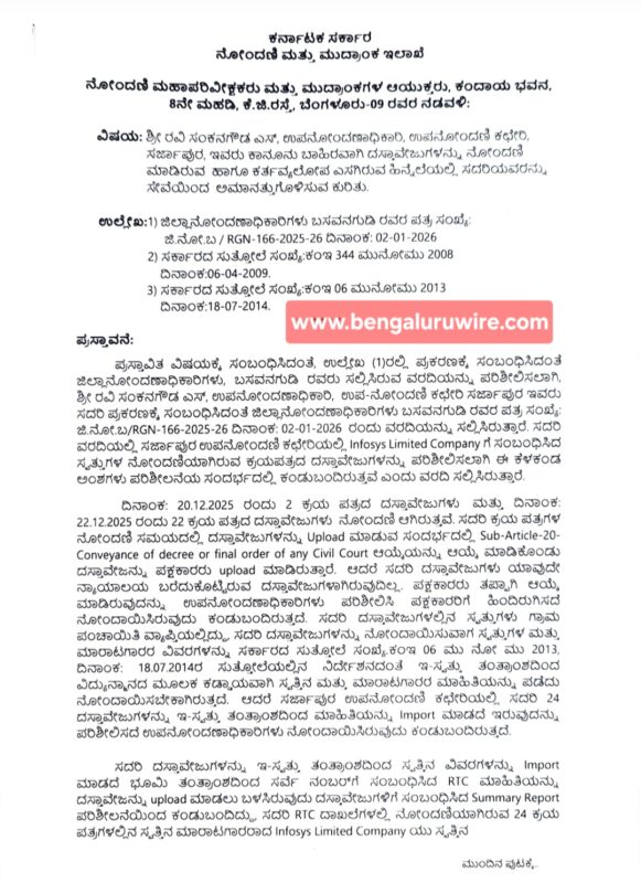ಸರ್ಜಾಪುರ ಉಪನೋಂದಣಿ ಕಚೇರಿಯಲ್ಲಿ ನಡೆದಿರುವ ಅವ್ಯವಹಾರ ಬೆಚ್ಚಿಬೀಳಿಸುವಂತಿದೆ. ಇನ್ಫೋಸಿಸ್ ಲಿಮಿಟೆಡ್ ಕಂಪನಿಗೆ ಸೇರಿದ ಕೋಟ್ಯಂತರ ರೂಪಾಯಿ ಮೌಲ್ಯದ ಸ್ಥಿರಾಸ್ತಿಯನ್ನು ನಿಯಮಬಾಹಿರವಾಗಿ ಖಾಸಗಿ ಕಂಪನಿಯೊಂದಕ್ಕೆ ಪರಭಾರೆ ಮಾಡಲಾಗಿದೆ. ಸರ್ಜಾಪುರ ಉಪನೋಂದಣಾಧಿಕಾರಿ ರವಿ ಸಂಕನಗೌಡ ಎಸ್. ಅವರು, ಯಾವುದೇ ನೈಜ ಸಿವಿಲ್ ನ್ಯಾಯಾಲಯದ ಆದೇಶವಿಲ್ಲದಿದ್ದರೂ, ತಂತ್ರಾಂಶದಲ್ಲಿ ‘Conveyance of decree or final order of any Civil Court’ (ಸಬ್-ಆರ್ಟಿಕಲ್ 20) ಎಂಬ ಆಯ್ಕೆಯನ್ನು ಬಳಸಿಕೊಂಡು ಇನ್ಫೋಸಿಸ್ ಆಸ್ತಿಯನ್ನು ನೋಂದಣಿ ಮಾಡಿದ್ದಾರೆ ಎಂದು ಅಮಾನತು ಆದೇಶದಲ್ಲಿ ತಿಳಿಸಲಾಗಿದೆ.