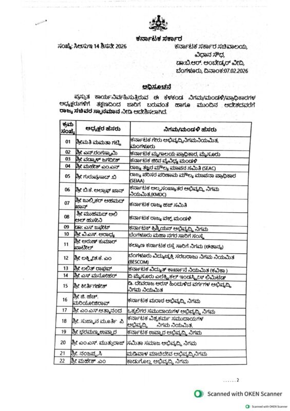 ಬೆಂಗಳೂರು, ಫೆ.07 www.bengaluruwire.com : ರಾಜ್ಯ ಸರ್ಕಾರ ಪ್ರಸ್ತುತ ಕಾರ್ಯನಿರ್ವಹಿಸುತ್ತಿರುವ ವಿವಿಧ ನಿಗಮ ಹಾಗೂ ಮಂಡಳಿಗಳ 54 ಅಧ್ಯಕ್ಷರಿಗೆ ‘ರಾಜ್ಯ ಸಚಿವರ’ (State Minister Rank) ಸ್ಥಾನಮಾನ ನೀಡಿ ಆದೇಶಿಸಿದೆ.