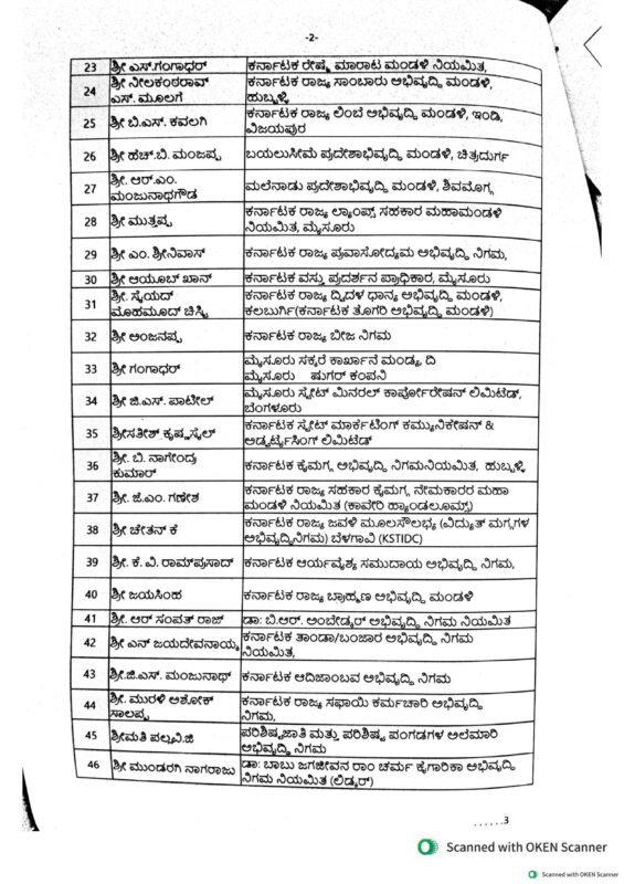 ರಾಜ್ಯದ ವಿವಿಧ ಅಭಿವೃದ್ಧಿ ನಿಗಮಗಳು, ಪ್ರಾಧಿಕಾರಗಳು ಹಾಗೂ ಮಂಡಳಿಗಳಿಗೆ ನೇಮಕಗೊಂಡಿರುವ ಅಧ್ಯಕ್ಷರ ಸಂಪೂರ್ಣ ಪಟ್ಟಿ ಮತ್ತು ಅವರಿಗೆ ಹಂಚಿಕೆಯಾಗಿರುವ ನಿಗಮಗಳ ವಿವರ ಈ ಕೆಳಗಿನಂತಿದೆ: