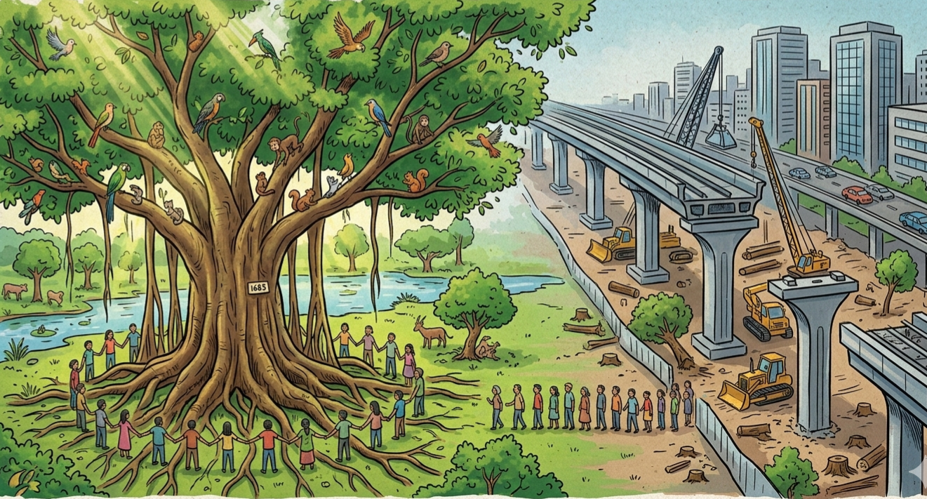 ನಾಗರಭಾವಿಯ 80 ಅಡಿ ರಸ್ತೆಯಲ್ಲಿರುವ ದೊಡ್ಡ ಆಲದ ಮರದ ಬಳಿ ನಡೆದ ಈ ಪ್ರತಿಭಟನೆಯಲ್ಲಿ ಪರಿಸರವಾದಿಗಳು ಮೆಟ್ರೋ ಮಾರ್ಗ ವಿನ್ಯಾಸದ ಬಗ್ಗೆ ತೀವ್ರ ಆಕ್ಷೇಪ ವ್ಯಕ್ತಪಡಿಸಿದರು. ಪ್ರಮುಖವಾಗಿ, ಮರ ಸಂಖ್ಯೆ 1683 ಎಂದು ಗುರುತಿಸಲಾದ ಸುಮಾರು 200 ವರ್ಷಗಳಿಗೂ ಅಧಿಕ ಇತಿಹಾಸವಿರುವ ಭವ್ಯವಾದ ‘ಹೆರಿಟೇಜ್’ ಮರವನ್ನು ಕಡಿಯಲು ಬಿಎಂಆರ್ಸಿಎಲ್ ಮುಂದಾಗಿರುವುದು ಪರಿಸರ ಪ್ರೇಮಿಗಳ ಕೆಂಗಣ್ಣಿಗೆ ಗುರಿಯಾಗಿದೆ.