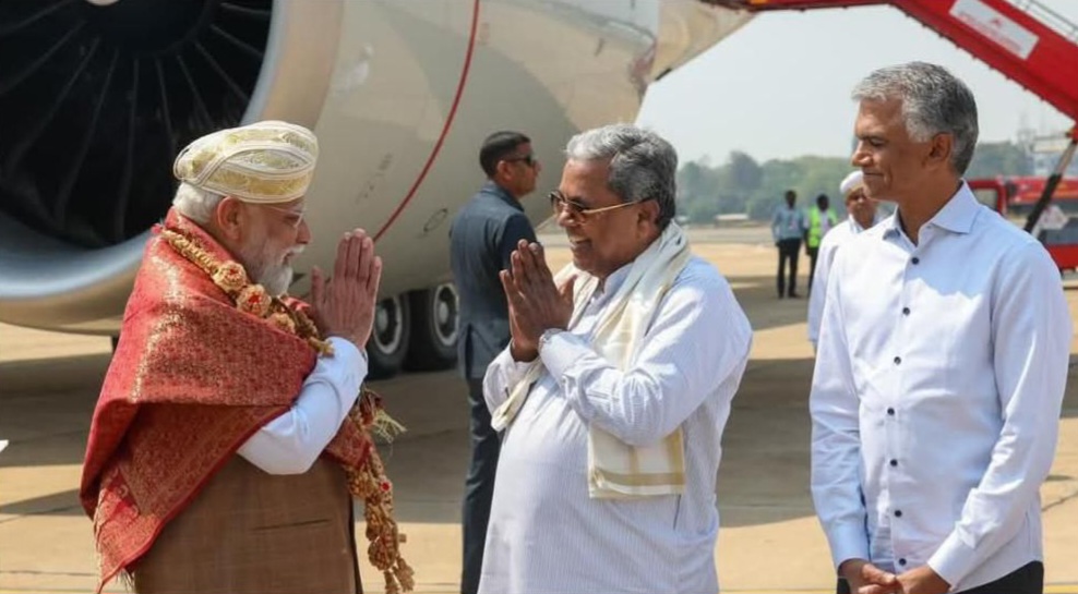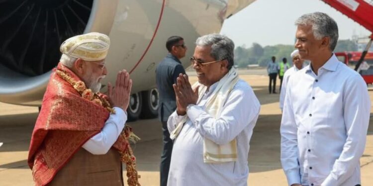 ಬೆಂಗಳೂರು, ಏ.15 www.bengaluruwire.com: ಆದಿಚುಂಚನಗಿರಿ ಮಠದ ಕಾರ್ಯಕ್ರಮದಲ್ಲಿ ಭಾಗವಹಿಸಲು ಇಂದು ಬೆಂಗಳೂರಿಗೆ ಆಗಮಿಸಿದ ಪ್ರಧಾನಿ ನರೇಂದ್ರ ಮೋದಿ ಅವರಿಗೆ ಎಚ್ಎಎಲ್ ವಿಮಾನ ನಿಲ್ದಾಣದಲ್ಲಿ ಮುಖ್ಯಮಂತ್ರಿ ಸಿದ್ದರಾಮಯ್ಯ ಅವರು ಆತ್ಮೀಯ ಸ್ವಾಗತ ಕೋರಿದರು.