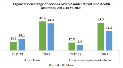 2017-18ರ ಅವಧಿಯಲ್ಲಿ ದೇಶದ ಗ್ರಾಮೀಣ ಭಾಗದಲ್ಲಿ ಕೇವಲ ಶೇ. 14ರಷ್ಟು ಮತ್ತು ನಗರ ಭಾಗದಲ್ಲಿ ಶೇ. 19ರಷ್ಟು ಜನರು ಮಾತ್ರ ಆರೋಗ್ಯ ವಿಮೆಯ ವ್ಯಾಪ್ತಿಯಲ್ಲಿದ್ದರು. ಆದರೆ ಈಗ, ದೇಶದ ಸುಮಾರು ಅರ್ಧದಷ್ಟು (ಶೇ. 47ಕ್ಕೂ ಹೆಚ್ಚು) ಜನಸಂಖ್ಯೆಯು ಆರೋಗ್ಯ ವಿಮೆಯ ಸುರಕ್ಷಾ ಚಕ್ರದ ಅಡಿಯಲ್ಲಿದೆ.
