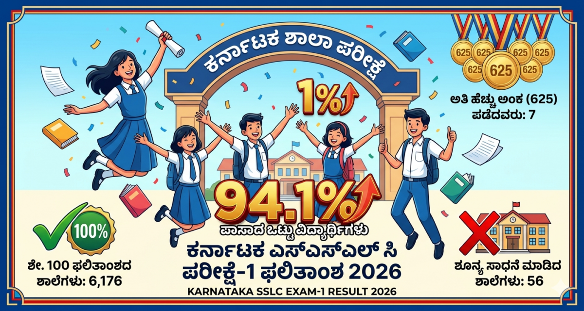 ಬೆಂಗಳೂರು, ಏ.23 www.bengaluruwire.com: ಕರ್ನಾಟಕ ಶಾಲಾ ಪರೀಕ್ಷೆ ಮತ್ತು ಮೌಲ್ಯನಿರ್ಣಯ ಮಂಡಳಿ (KSEAB) ಇಂದು 2026ರ ಎಸ್ಎಸ್ಎಲ್ಸಿ (SSLC) ಪರೀಕ್ಷೆ-1ರ ಫಲಿತಾಂಶವನ್ನು ಪ್ರಕಟಿಸಿದ್ದು, ರಾಜ್ಯದ ಶೈಕ್ಷಣಿಕ ಇತಿಹಾಸದಲ್ಲೇ ದಾಖಲೆಯ ಶೇ. 94.10 ರಷ್ಟು ಫಲಿತಾಂಶ ದಾಖಲಾಗಿದೆ.
