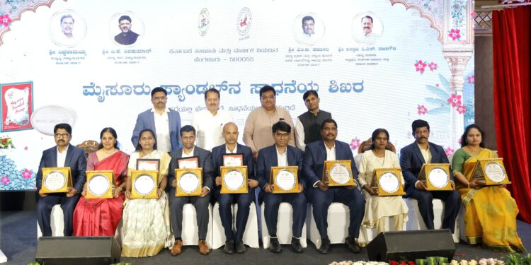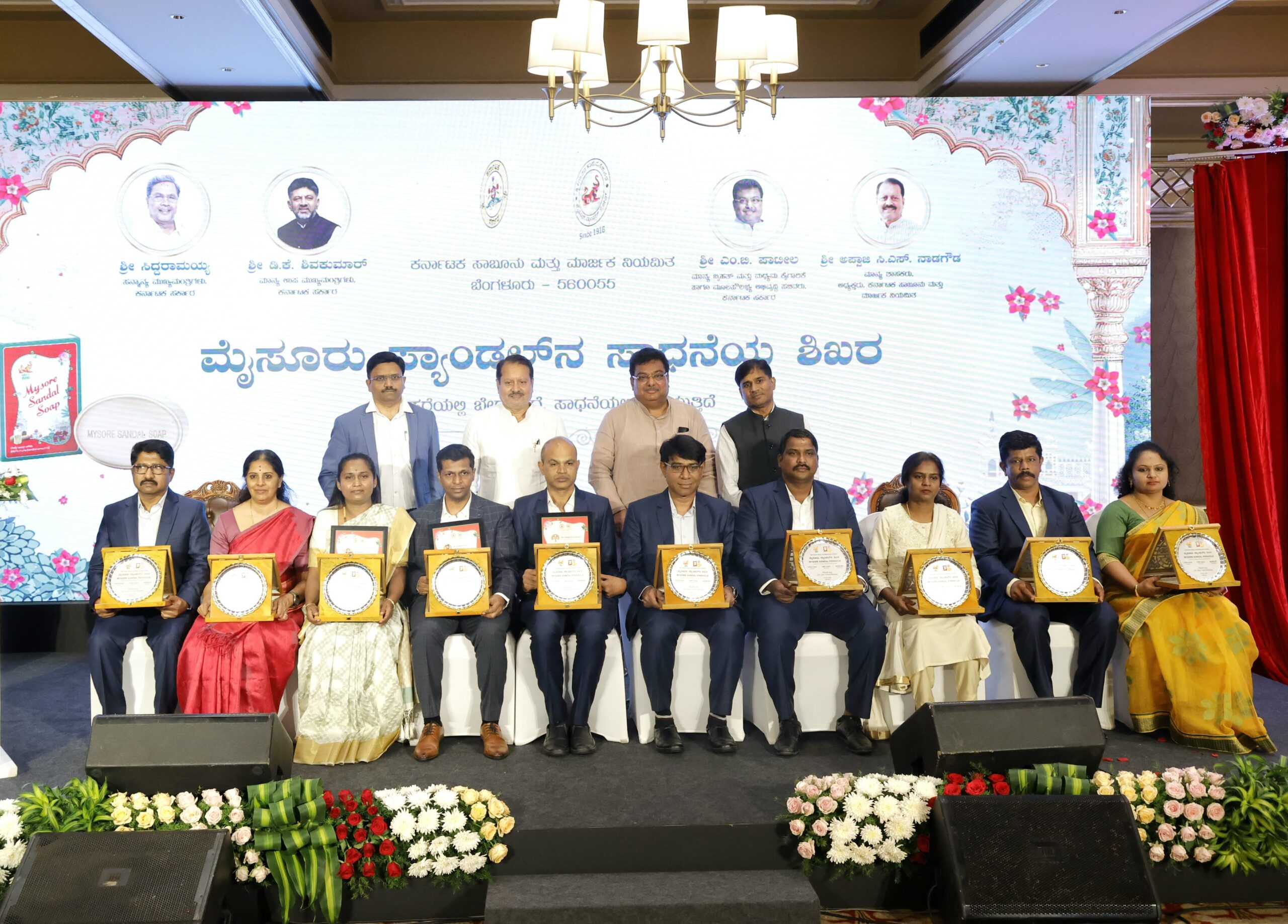 ನಗರದ ಖಾಸಗಿ ಹೋಟೆಲ್ನಲ್ಲಿ ಮಂಗಳವಾರ ಆಯೋಜಿಸಲಾಗಿದ್ದ ‘ಮೈಸೂರು ಸ್ಯಾಂಡಲ್ ಸಾಧನೆಯ ಶಿಖರ’ ಕಾರ್ಯಕ್ರಮದಲ್ಲಿ ಸಂಸ್ಥೆಯ ಮಾರುಕಟ್ಟೆ ವಿಭಾಗದ ಮುಖ್ಯಸ್ಥರಾದ ಅರವಿಂದ್ ಸೇರಿದಂತೆ ಇತರ ಅಧಿಕಾರಿಗಳು ಮತ್ತು ಸಿಬ್ಬಂದಿಯನ್ನು ಸನ್ಮಾನಿಸಿ ಮಾತನಾಡಿದರು.